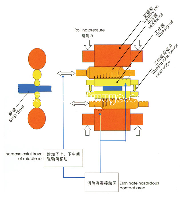 2. That hydraulic bending devices and middle rollers horizontal moving installations can fast regulate the roller’s gibbous degree to change the distribution of touching pressure between rollers in order to eliminate the harmful touching areas of rollers to aim to control the plate shape and gibbous degree.